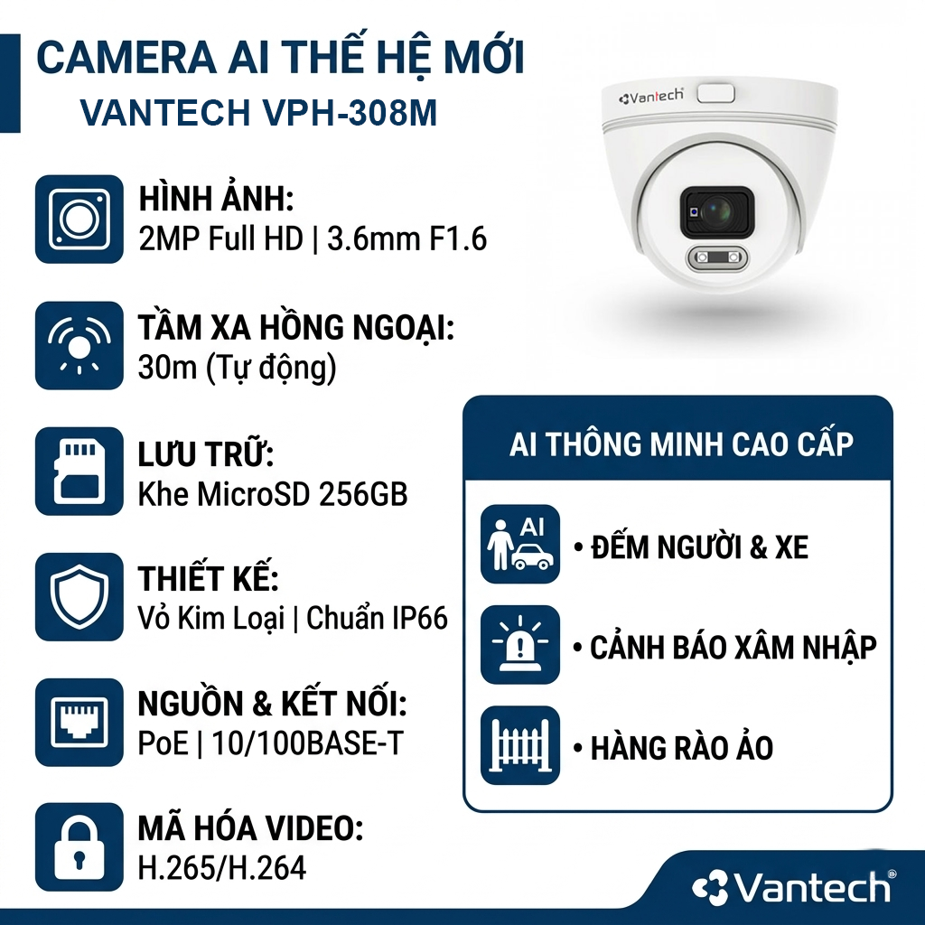 Với sự kết hợp hoàn hảo giữa thiết kế chắc chắn, hình ảnh sắc nét và công nghệ AI hiện đại, Camera VPH-308M / VPH-309M tự tin mang đến sự an tâm tuyệt đối cho không gian của bạn.